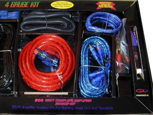 Power Kit 4 Características principales:• Cable RCA de interconexión con malla protectorainterna con ángulo recto de 609.60 cm• Cable de Poder para alimentación rojo 609.60 cm GAU 4• Cable de Poder para tierra azul 121.92 cm GAU 4• Cable para parlante 609.60 cm GAU 12• Cable para encendido remoto azul 609.60 cm GAU 16• Portafusible resistente al agua tipo AGU GAU 4• Fusible AGU 80 Amp• Borne Terminal de alta resistencia GAU 4• Tubo corrugado para organización de cableado NegroGAU 4